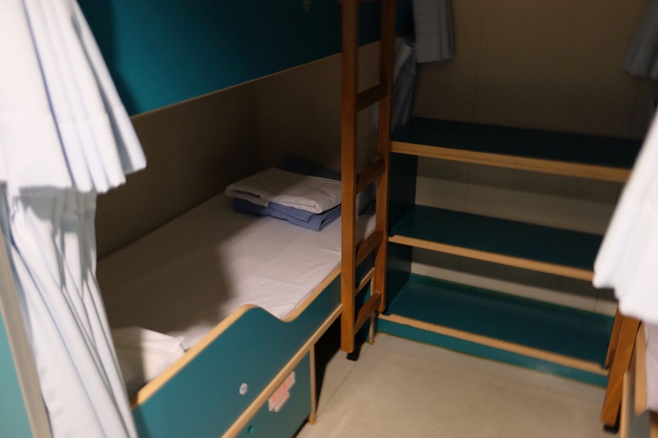 窓はありますが外は見えません、隣の部屋の窓がうっすら見えますね、一番安い1等室なのでこんなもんです、でも良かったのは冷蔵庫とトイレが付いている事です、シャワーも付いてますが、大浴場があるので使用しませんでした