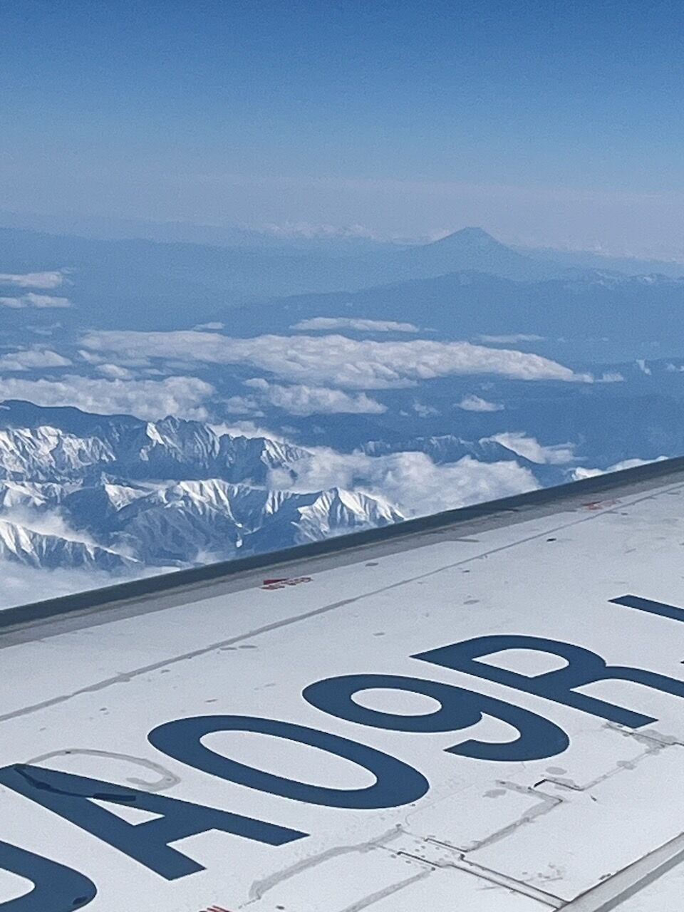 奥に富士山、手前に北アルプスが見えました、富山県付近だと思われますが、富士山見えました